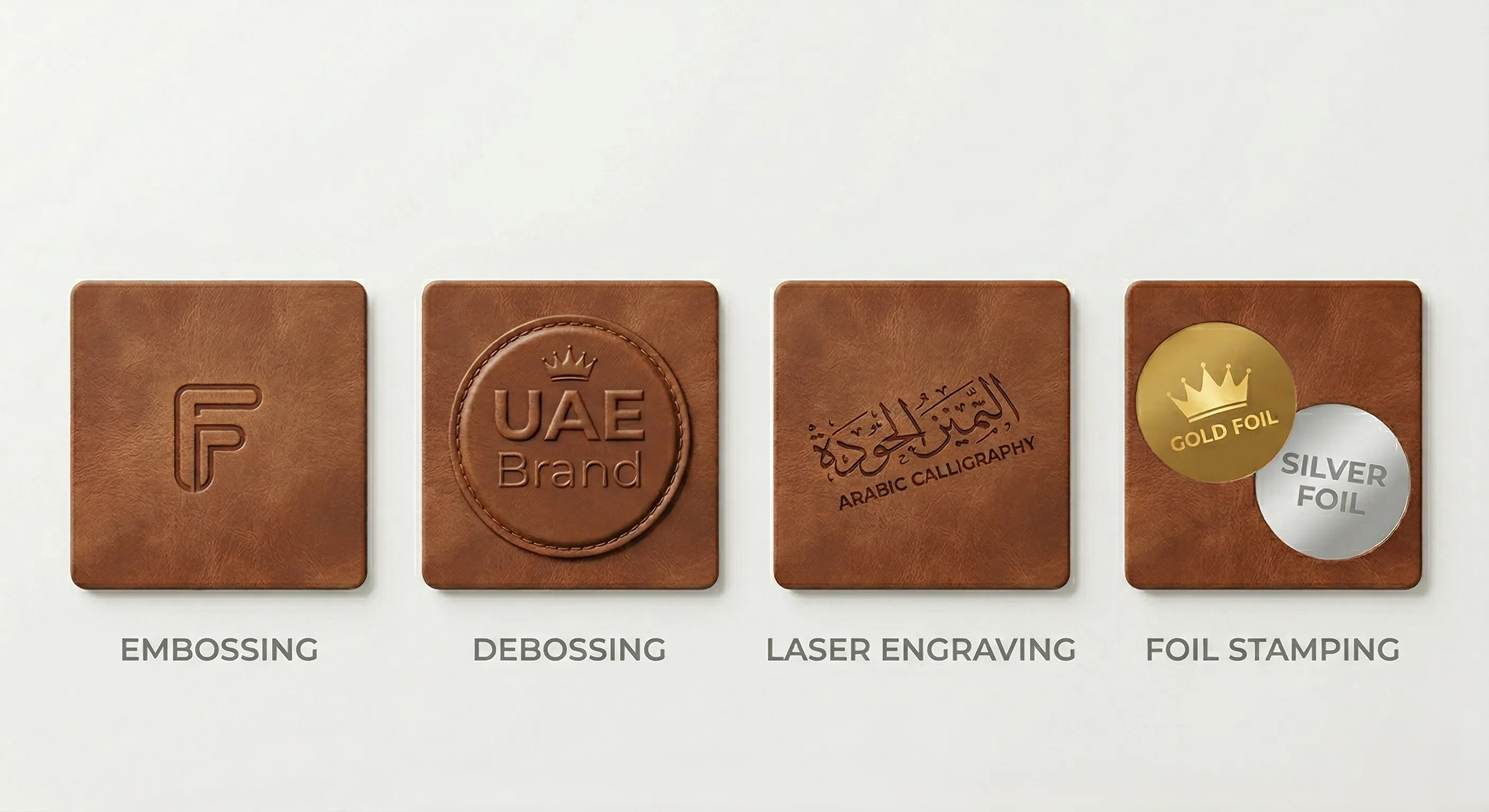 When ordering leather coasters with logo in Dubai, there are several premium techniques available, each offering a distinct aesthetic suited to different corporate identities across the UAE: